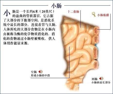 成人的空肠、回肠长约5米,其中空肠约占五分之二,回肠约占五分之三,两者之间无明显的分界线。