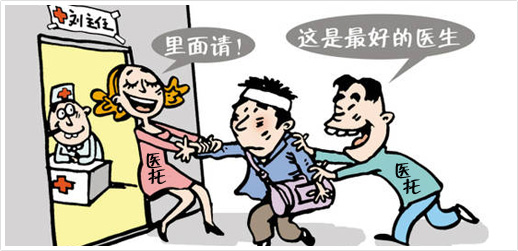 “医托”惯用的招术是:找目标——搭讪套取病情——介绍“黑医”——“黑医”看病——卖“”狂赚。医托一般会拎着医院放射科的袋子,或抱着小孩,假装是来看病的,随后就四处搭讪,寻找目标。甚至一路跟踪,偷听您与亲友聊天、打电话的内容。来自农村、操外地口音的人往往成为他们的。套取病情后,“医托”就见机行事,装成您的熟人、老乡,诉说在大医院看病的种种不是,然后说自己或亲戚得同样的病在哪里看好的,吹嘘一番那家医院如何好、医生技术有多高明……看到您有些心动,“医托”就会拿出纸和笔,写好医院名称、地址及前去的路线,甚至陪您去看病。当您怀着莫大的感激之情见到“好”医生时,您鼓鼓的钱包就换成了一堆不知名的粉或草。