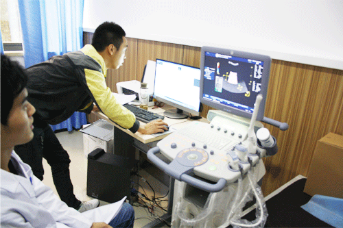 图为AE进口彩色多普勒超声系,AE中国地区技术员正在紧张有序的测试系统