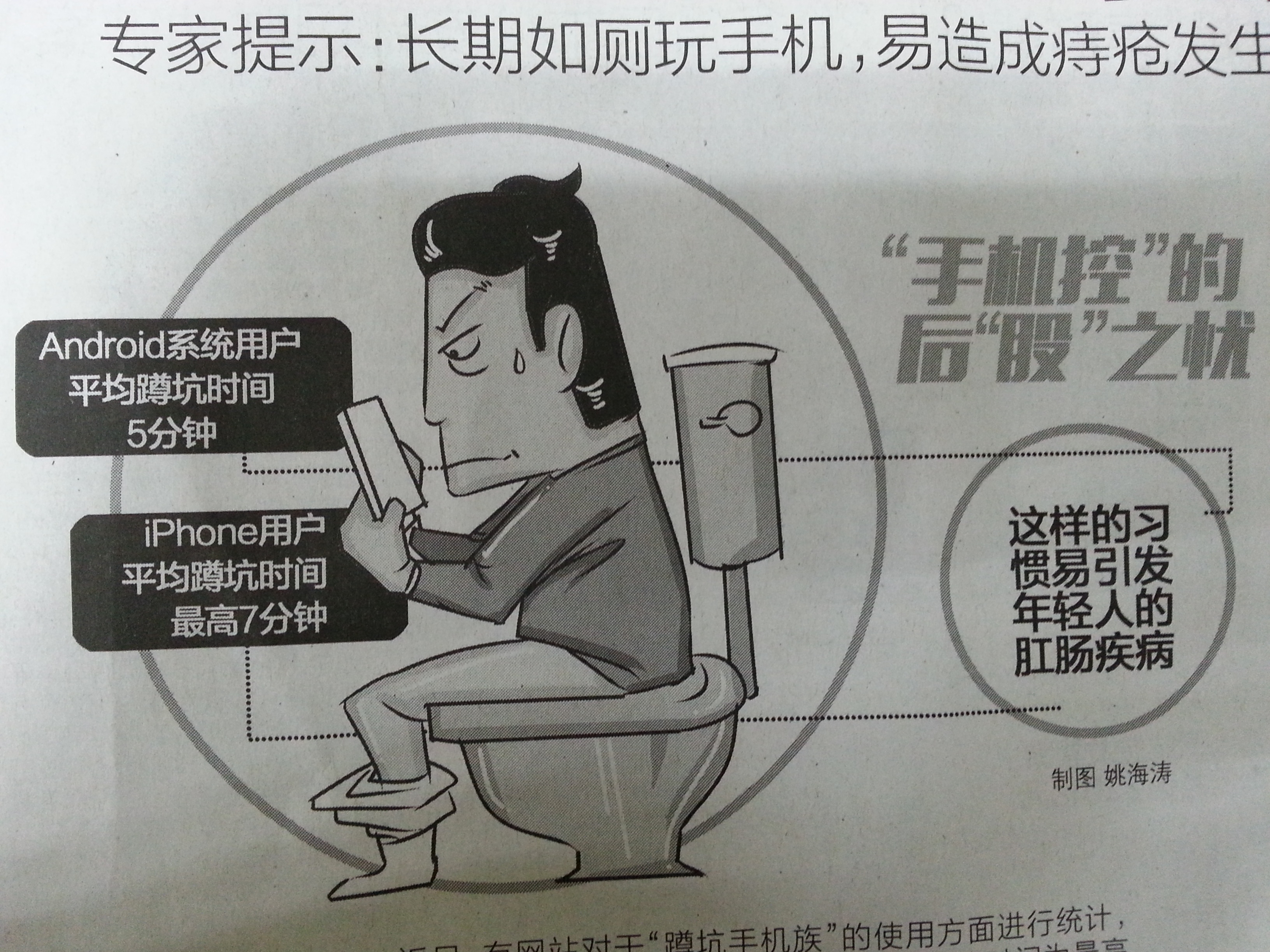 近日,有网站对于“蹲坑手机族”的使用方面进行统计,在“蹲坑”时间上,使用iPhone的用户平均蹲坑时间为较高的7分钟,而Android系统用户则分别为5.4分钟和5分钟。“手机控”的出现导致年轻人蹲坑时间迅速延长,肛肠疾病愈发多见于年轻人身上。