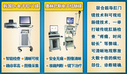 电子肛门镜:针对肛门、直肠下段进行检查,采用医用视频技术和48万像素的高清数字摄像技术,将肠道内部的图像传输于计算机处理中心,显示于监视器屏幕上,医患双方都可以清晰的观察到放大数十倍后的病灶部位,其图像清晰、逼真。