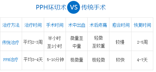 PPH术治疗痔疮整个过程只需5-10分钟左右。因为受术部位为粘膜层,不会损伤肛周真皮层,故术中术后疼痛。因为环形切除痔体及粘膜为非开放性伤口,所以恢复周期极短。由于PPH术不涉及肛垫,不损伤肛门括约肌,所以不会造成肛门狭窄、肛门失禁等后遗症,十分安全。